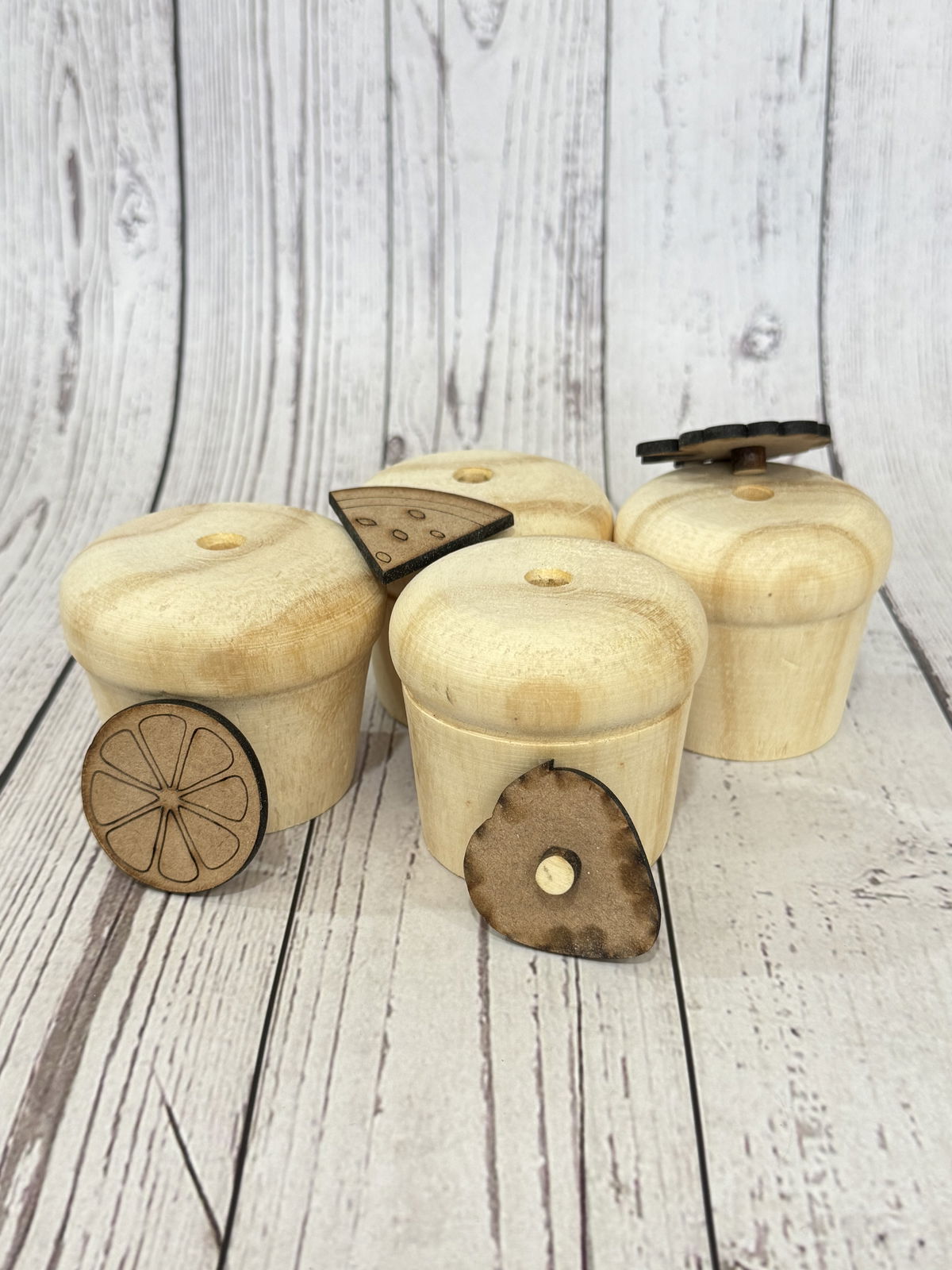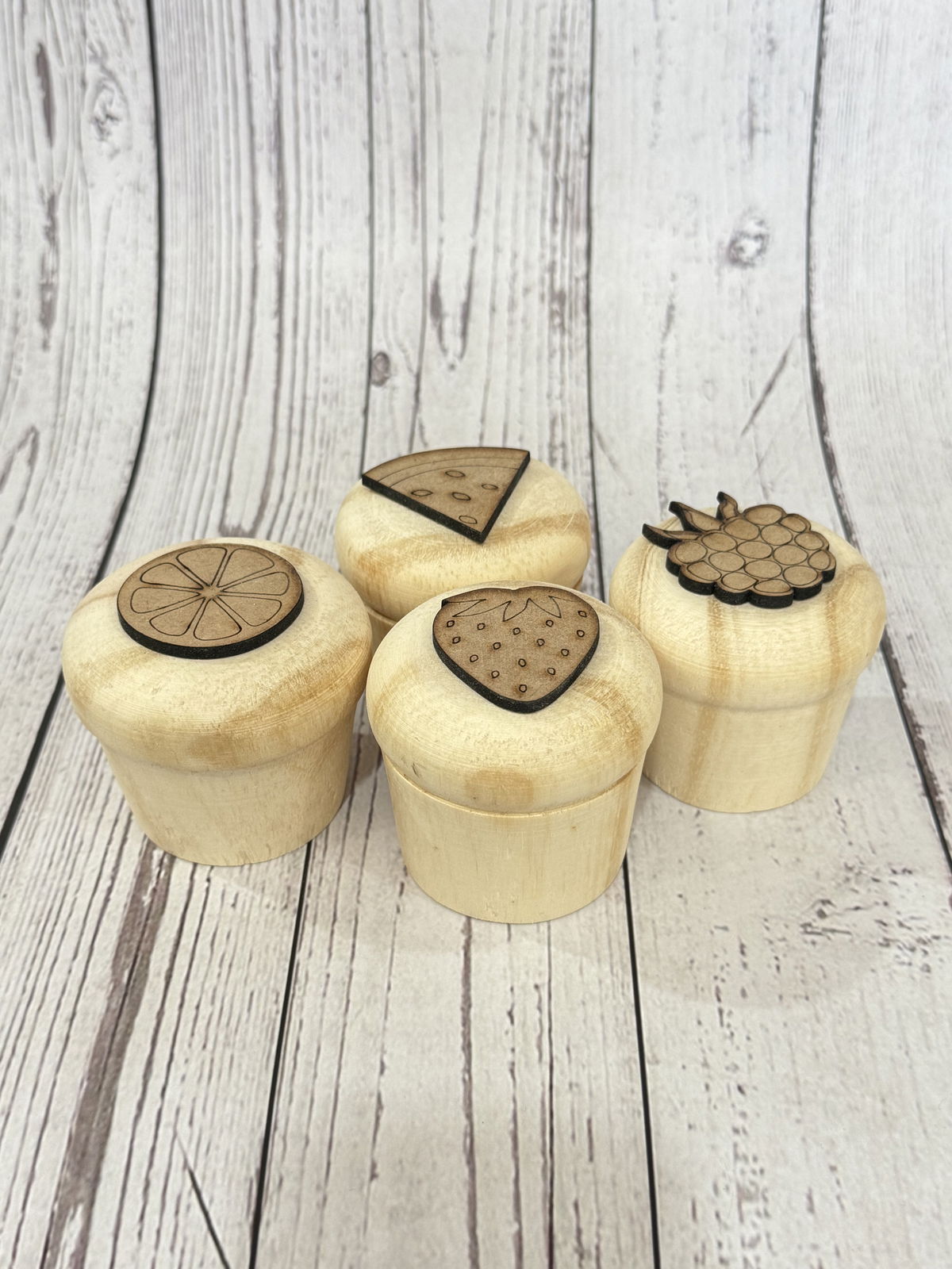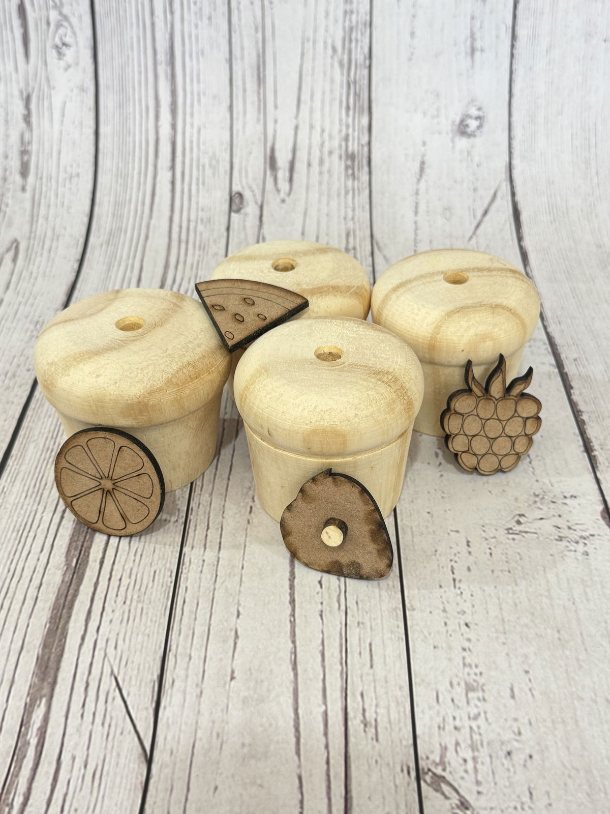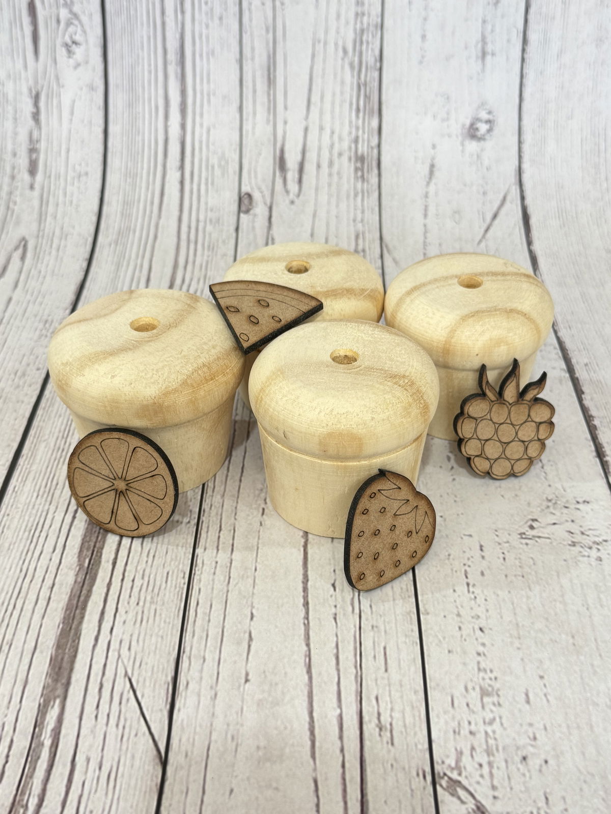 Contiene 4 frutas caladas laser, para aplicar a cada cupcake.