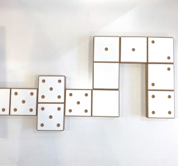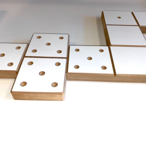 28 Fichas de MDF cubierto en Melamina Blanca. Cada ficha tiene grabado los puntitos que forman la ficha del domino.