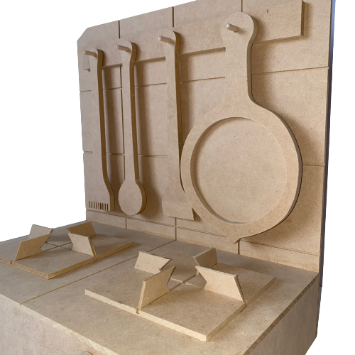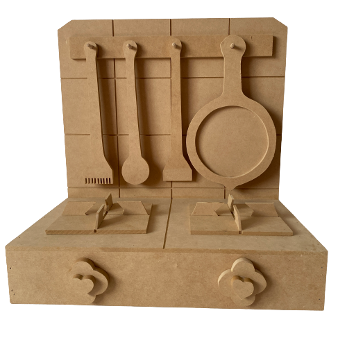 Anafe de MDF. Incluye tenedor, cuchara, espatula y sarten.