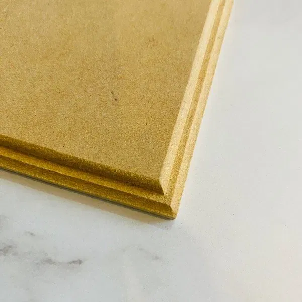 Corte de MDF de espesor 9mm. La medida total es del corte, incluyendo la moldura. Sin la moldura, la superfice es aprox 1,5cm menos. Por ejemplo, el corte de 10x10cm mide sin la moldura 8,5 x 8,5cm aprox.